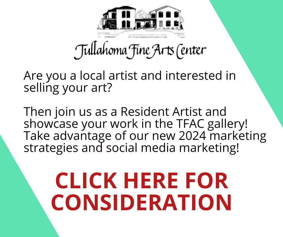 The Resident Artist's Gallery is a year-round permanent gallery exhibition showcasing the Tullahoma Fine Arts Center's local and regional artist members.